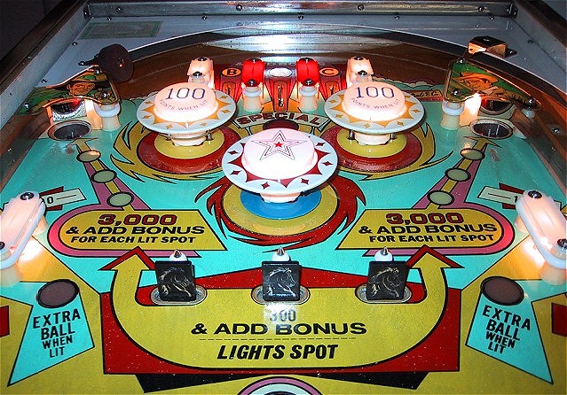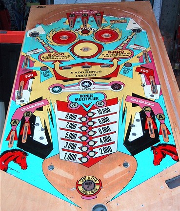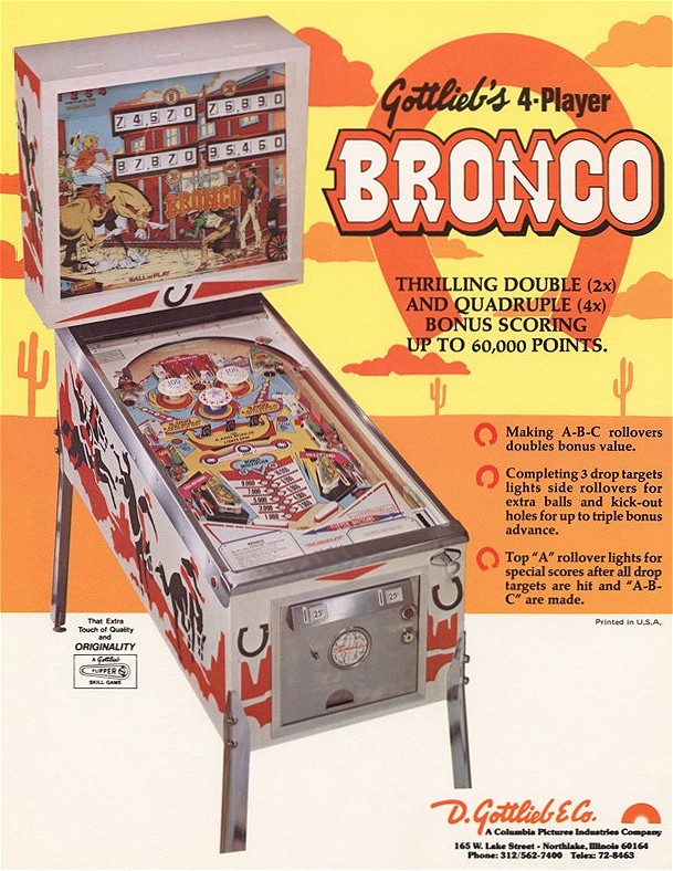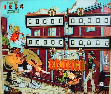 Bronco Story: Bronco was the first "EM" pinball machine I owned. I bought it at the urging of my wife who wanted a pinball machine with a horse theme and "the bells". She likes the slower play of the EMs and was bugging me to get one. This particular machine was offered for sale on the Mr. Pinball classifieds by a local seller about 15 minutes away. Needless to say we jumped at the sale and picked up the machine. It was a pretty uneventful purchase for me (every pinball purchase or sale I do seems to have a saga attached to it!) The machine worked fine from the start and was enjoyed for almost two years. I grew tired of it after about one day (it doesn't even have any slingshot kickers!), but it was enjoyed by visitors who where a bit too shy to step up to the newer machines. Typical of Gottlieb pins of the era, it has a symmetrical design (both sides of the playfield are the same) and plays very slowly. An acquaintance of ours husband owns an antique "marketplace" in town and asked me if I was interested in selling one of my machines there. He was doing up a soda shop type thing with an actual fountain counter setup, an old bubbler jukebox and some restored Vendo Coke machines. He said than an EM pinball would be a wonderful compliment. Neither of my other two EMs (Gottlieb's Masquerade, 1965 and Bally's Captain Fantastic) are in any shape to sell, so I volunteered to bring over the Bronco since it wasn't something I needed to hang onto. I did a quick shop/restoration job on the machine and it was ready to go! He bought the machine in January of 2002 and it sold in March. |