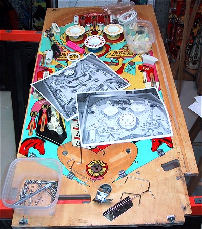 | I take photos of the playfield from about every angle possible before starting a restoration job. This way I have a reference other than my head when it comes to putting it all back together. The shot below shows an example of two of the photos (digital and printed back out on a laser printer) I used to put everything back where it belonged.