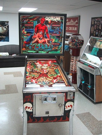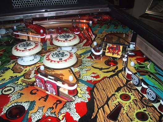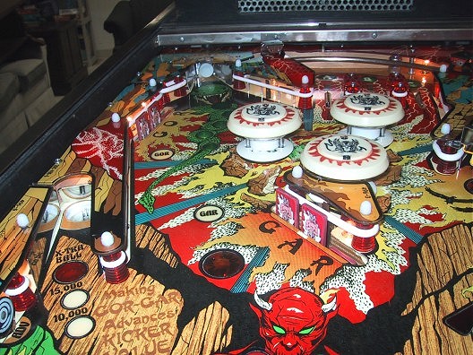 after a good cleaning, some touch-up paint and several coats of wax: I went on an Internet scavenger hunt for parts and located a coin door, drop target hardware and the missing plastics. I raided one of the Firepower's that is sitting in my "to-do" queue and got a transformer and related power supply parts and the displays and display driver. I had a "funky" system 6A board that I had removed from a Firepower, so I rebuilt that board and burned a new set of ROMs for Gorgar. Another Firepower I had bought at the Allentown show supposedly didn't have any boards in it, but when I opened the head to get the transformer out, it had a nice driver board, so that got thrown into the mix. The only thing missing was a sound/speech board and I pulled the one from the Blackout I just bought. Call this the Frankenstein pinball machine! New rubbers and #47 bulbs all around finished the game up nicely. The backglass came from Mayfair. Its not a repro or NOS, but they had one that's between and 7 and 8 in quality. Side View of the Game: