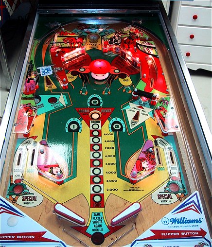 Game Facts: The Mr. Pinball Guide states that 4,903 Hot Tips were produced in solid state format and 1,300 were produced in EM format. Hot Tip was designed by Tony Kramer (Algar, Disco Fever, Tri-Zone and Pharaoh) with art work by Christian Marche. One of my favorite features of the game is the fact that it still uses EM style chimes rather than electronic sound. It still dings and dongs when you score, plus just to make sure you know you're scoring, there is even an old EM score reel in the cabinet that is "clicked" every time you rack up some more points! Williams introduced electronic sound with World Cup two games later, but the sound is so poor by today's standards that the chimes and reels of Hot Tip are a symphony in comparison. Not until Flash and its continuous background sound did electronic sound finally surpass the chime unit.