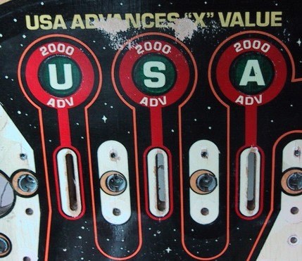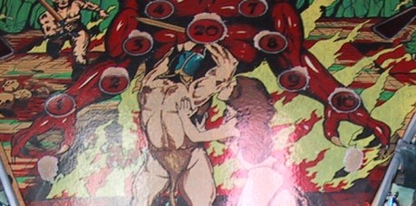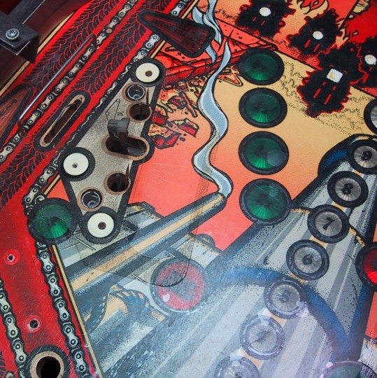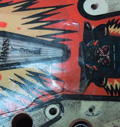 The ball rolling over the inserts has worn off most of the paint around the inserts. Two other area that take quite a beating are around the pop bumpers and the slingshot kickers. The force of the ball being "kicked" back onto the playfield wears a hole in the paint quickly: