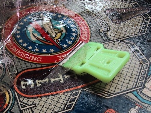 In the above photo on the left of the Space Shuttle playfield, there were three layers of Mylar. The semi-circle of Mylar was actually two layers deep! Imagine my surprise when I removed the semi-circle, only to be faced with another. When and Why to Remove Mylar The decision to remove Mylar usually seems like a simple one. If it looks dirty or is bubbling, take it off. But before you rush into a decision to remove the Mylar from your game, keep these points in mind: 1. How bad is the Mylar? If it just has a gray tinge to it, cleaning it using a product such as Novus 2 will normally bring it back to life. It it has just a few bubbles, you can usually flatten them out using this technique: