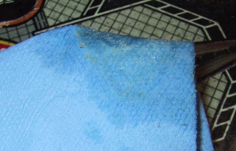 Once you get all of the Mylar off its time to get rid of the glue residue. Start squirting Goo-Gone on a small area of the playfield and using the shop towels start rubbing the glue off. Make sure you rotate the area of the towel your rubbing with so that your never rubbing glue with glue. Change towels often. You'll probably go through an entire roll of shop towels getting the glue off. Inserts are more difficult, but the glue will come off! Don't use a razor blade during this part of the removal process. You'll just wind up scratching your playfield. Once you think you've gotten all of the glue off in an area, squirt more Goo-Gone over the area and this time use a clean white towel. Check the towel and make sure there is no glue residue on the towel. Then move onto the next area. In the photo below the yellow globs on the towel is the glue you'll be removing. Keep at it until the playfield is completely clear of glue.