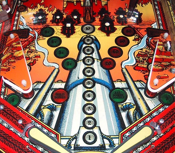 What is Mylar? To most of us Mylar is just a tough plastic. I did a bit of research and came up with the fact that Mylar is a trademark of the Dupont Corporation for a polyester film. I went to the Dupont website to get their definition of Mylar: "The leading polyester film and popular laminating substrate for flexible packaging structures, Mylar® combines easy machinability, strength, high- and low-temperature resistance, crystal clarity, and printability. Plain or metallized, formable, heat-shrinkable and/or coated for barrier, printing or sealing -- tough, beautiful Mylar® polyester films offer an outstanding barrier to gas and water vapor, with excellent flex and puncture resistance." Why is it used in Pinball Games? When a pinball playfield starts to get dirty, the force of a steel ball rolling over the dirt acts like sandpaper and starts wearing at the paint. The first sign of wear are those annoying "ball swirl" marks in the paint. This is fine dirt ground down into the playfield. As time wears on (pun intended..), this sandpaper type action will wear down the paint until there are bare wood spots on the playfield. There is increased wear on a playfield wherever the surface is uneven. This occurs around most playfield inserts and drop target areas. The ball repeatedly rolling over the ridge between surfaces will start to eat away at the paint. You can see an extreme case of this in the photo of the Gorgar playfield below: