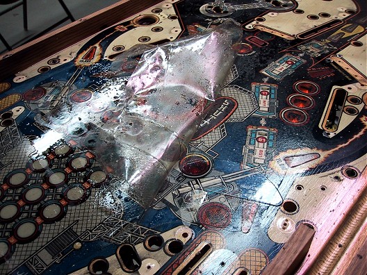 Removal Page. There were several applications of Mylar on the playfield, having been added at various points in the machine's past. I removed three layers of Mylar at the point where the ramp drops the ball back onto the playfield! The Mylar was removed with Goo-Gone, a cleaning solvent that dissolves the glue holding the Mylar onto the playfield.