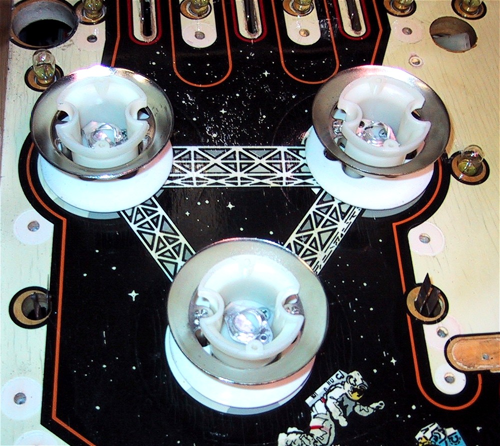 After the Mylar was removed, the playfield was given 4 coats of wax and then reassembled. All lamp sockets were removed and cleaned, and all bulbs were replaced with new #47 bulbs. The pop bumper assemblies were rebuilt, with all new parts, including new lamp sockets. The flippers were also rebuilt, with the proper coils installed. The right flipper had a more powerful coil that caused numerous airballs, replacing it with the proper strength coil vastly improved the play of the game - moral of the story - a stronger coil does not necessarily mean better flippers!