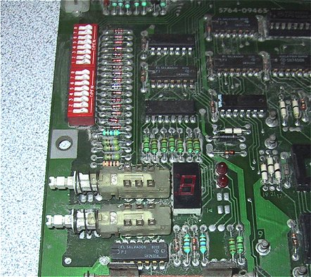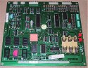 circuits: The two bridge rectifiers bolted to the backbox are for Solenoid and Lamp power and have nothing to do with the logic (CPU) power. Same goes for the large capacitor mounted in the back box, its used for the lamp power supply only. Another often confused area is the value of the +12 volt unregulated power circuit. Since it is not regulated, it will vary depending on the line voltage. It can range anywhere from 10 to 14 volts, and this is normal. This voltage is monitored by the MPU board to determine when you've turned off the power so it can shut down things like the displays so they're not damaged during power down. People will attempt to "repair" their power supplies because they're not getting 12 volts, only 11 volts. Later System 7 games used 50 volt flipper coils and had an additional "flipper" power supply board (and an additional transformer in the cabinet). Sound Board The first two Williams Solid State games, Hot Tip and Lucky Seven, continued to use "chimes" like the electro-mechanical games. Hot Tip also had a "dummy" score reel in the cabinet that would be incremented to make the familiar scoring sound. World Cup was the first Williams game to use electronic sound. Sound boards are actually self-contained computers, complete with their own power supply, microprocessor and PIA. The game "sees" the sound board as a set of solenoids, using the same controls on the driver board to trigger different sounds as it would to fire a solenoid. Games from World Cup to Pokerino used a sound board that would generate a sound when an activity occurred (scoring, etc.). However when the ball wasn't hitting anything, no sound was being produced. Starting with Flash, a revised sound board was used that would generate "constant" or "continuous" background sounds. These usually varied in pitch as scoring increased, giving the player an adrenaline boost when things really got going. Gorgar introduced speech to the pinball world. A redesigned sound board featured a connector for an add-on speech module. Speech was featured on Gorgar, Firepower, Blackout, Alien Poker, Black Knight, Jungle Lord and Pharaoh. The recession of the early 80s that almost drove Williams out of business caused major cost cutting moves in pinball production, and speech was eliminated from all System 7 games after Pharaoh. The sound board in these later games is missing the connector that was used to connect the ribbon cable from the speech board to the sound board, showing how far they went in reducing production costs. Displays Williams used a standard 6 digit gas filled display in all its games through Algar. These are still widely available today. Most displays today have a "nipple" where they were sealed. These will work fine as a replacement, and most display boards already have a hole drilled in them. The last two System 6 games (Algar and Alien Poker) use 7 digit displays and all System 7 games used a 7 digit display. Display Driver The display driver is mounted just behind the backglass on the front of the display panel. The display driver also contains the credit/match display. The job of the display driver is to take the binary score data coming from the MPU board and translate into the signals understood by the displays. There were two versions of the display driver manufactured, and both are compatible in all games. One uses "discreet" components (meaning a large number of individual transistors) and the other uses integrated circuits. The reason for this is that the UDN6184 "segment driver" chip that Williams used became very short in supply. Williams designed an alternate board that replaced the functionality of the UDN6184 with individual transistors. The UDN6184 chip continues to be in short supply today, and averages between $15 and $20 a piece. Display board from a System 6 game showing the 4 score displays and the combination display driver/credit match display unit: