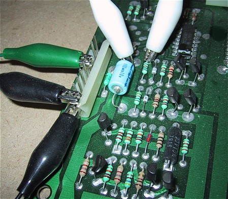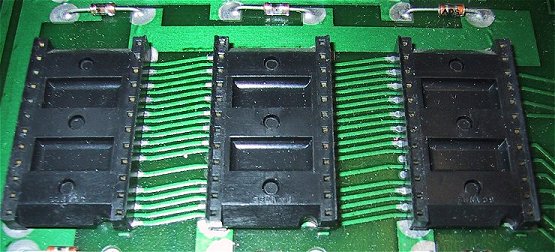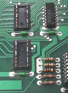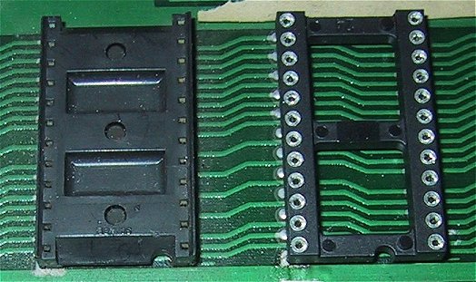 System 4 board with IC9 and IC10 removed and replaced with DIP Headers. Notice the pins that have been soldered together.