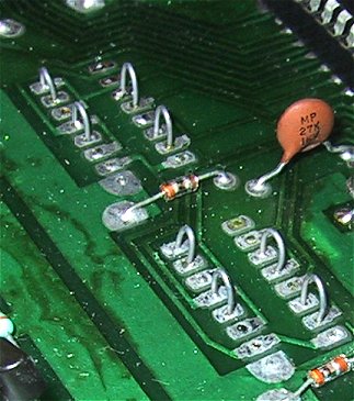 2.5.2. Connect the Power. If you are testing the board on your bench, you'll need to connect it to your power supply. Connect pin 1 of IJ2 to ground and connect either pin 4,5 or 6 to +5 volts. In order to get the test ROM to work in a system 6 or 7 board, you will need to either supply 12 volts to pin 9 or the jumper the reset circuit. To jumper a System 6 board, jumper the top leads of R27 and C23. On a System 7 board, jumper the bottom leads of R27 and C23. If you have an "original" System 3 board without the reset modifications you will also need to supply +12 volts to pin 9. System 3 boards with the reset modifications and System 4 boards will boot without any voltage at pin 9. Power connections and R27 and C23 jumpered on a System 6