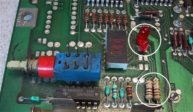 2.3 Get the schematics: The schematics for the boards will also be necessary if any of the tests fail. These are in your game manual and also available in Acrobat PDF form here. I highly recommend having a printed set of documents for your game that you leave in the game at all times. You can buy quality reproduction sets from Pinball Resource. 2.4 Build your test LED (now optional using the new test ROM): Several of the tests require the use of a "test LED" and cannot be performed using a Logic Probe. Specifically, the memory test and the Special Solenoid test (see section 5). A logic probe is too sensitive and will show a false good reading. Update 10/30/03 - If you are using a version of the test ROM new than October 2003, then you will no longer need to use the test LED to perform the memory test. I still recommend that you make one, it should cost you no more than 50 cents for a LED and resistor. You'll need it for the special solenoid test on the driver board and for a MPU test if your LEDs aren't flashing.